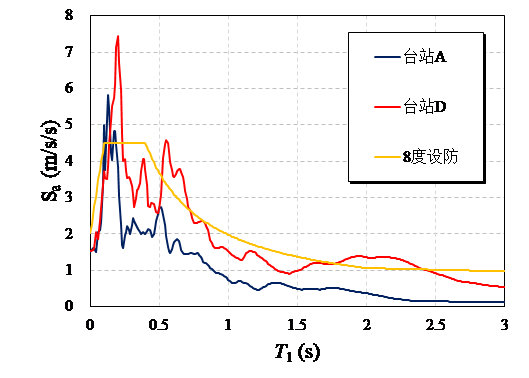 但是,如果我们把台站A和台站D的地面运动反应谱画出来,如图6所示,则可以清楚的看出,台站D的破坏能力要明显强于台站A。而无论是根据仪器记录的PGA,还是根据PAGER给出的烈度分布,都难以准确区分这一重要差异。